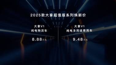 同样引人瞩目的还有诚意满满的售价!大拿V1-纯电物流车,焕新价88,800元;纯电多用途乘用车,焕新价94,800元,给到用户实实在在的优惠,真正做到让用户省心、省力、省钱。